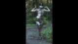 手首と首を拘束するSMグッズで縛られてお腹をくすぐられる。